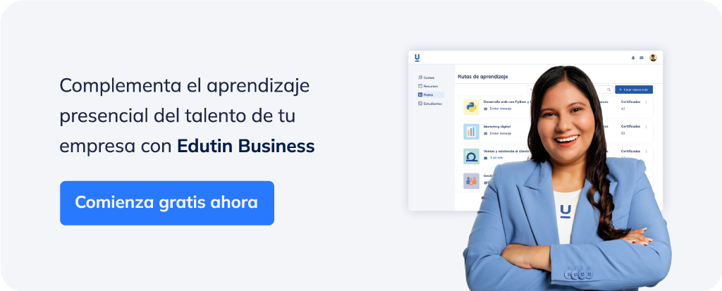 Al proporcionar tanto recursos en línea como presenciales, tu empresa asegura que los empleados tengan a su disposición una gama completa de herramientas para su aprendizaje. Los cursos de Edutin Business, disponen de estas herramientas que incluyen lecturas, videos explicativos, proyectos, actividades de la vida real; que permiten a los miembros de tu equipo poner en práctica su aprendizaje y reforzar sus conocimientos y habilidades.